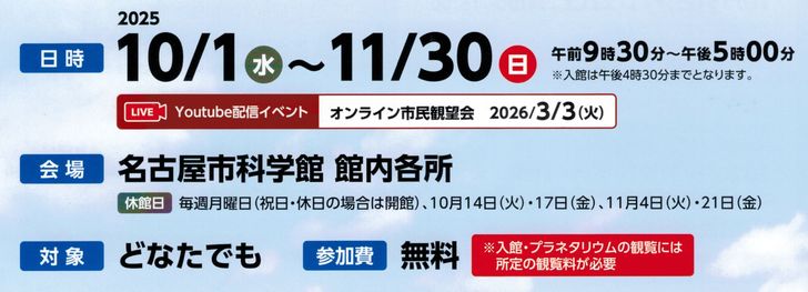 開催日時は2025年10月1日(水)から11月30日(日)、名古屋市科学館の各所で催し物が開催されます。