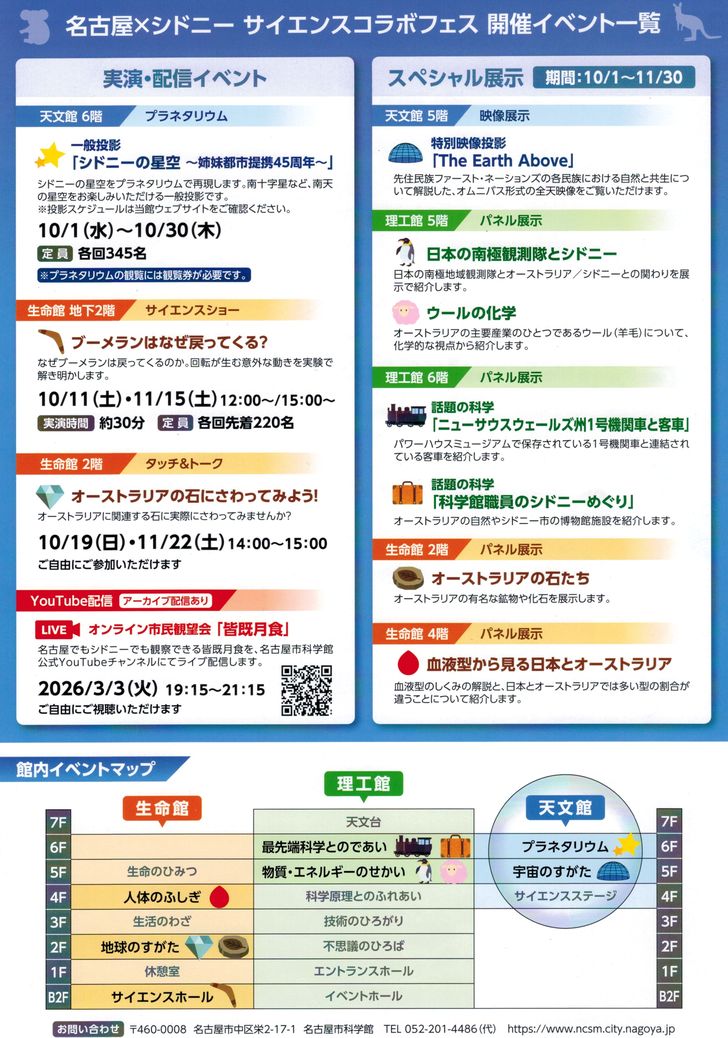 2025年、名古屋市とシドニー市の姉妹都市提携から45周年を迎えます。名古屋市科学館では科学のさまざまな分野をテーマにした、シドニー市・オーストラリアにまつわる展示・実演イベントが開催されます。