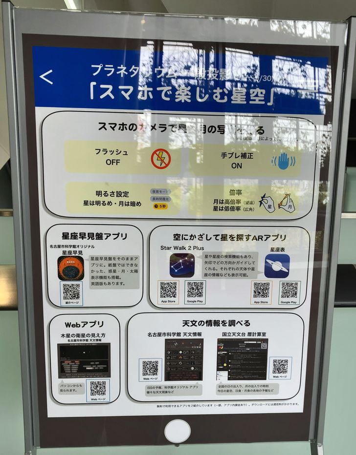 天文館5階の通路に「スマホで楽しむ星空」のパネル解説がありました。