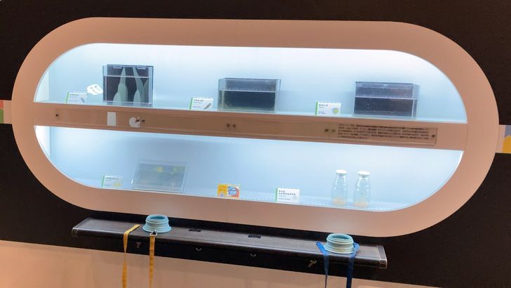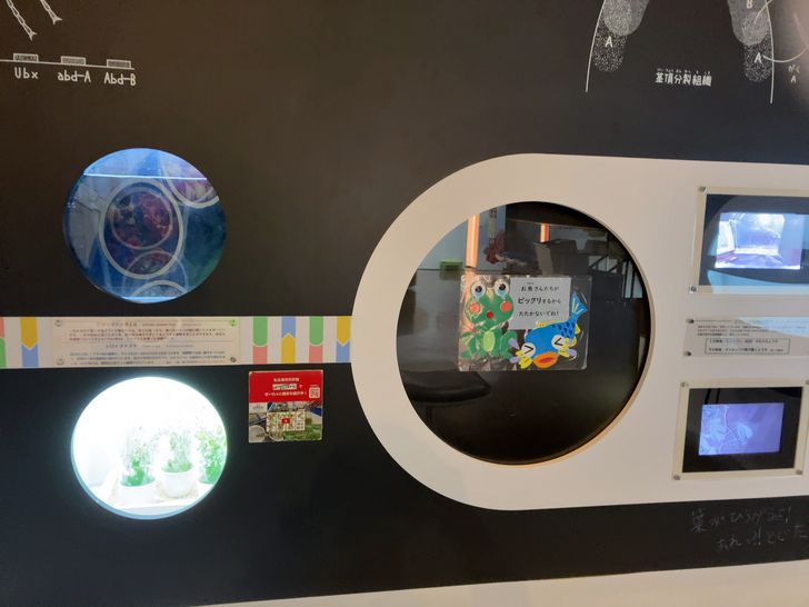 生命館5階「生命のひみつ」のフロアでは、展示を見るときの「注意表示」や、微小生物観察用のルーペに工夫がありました。