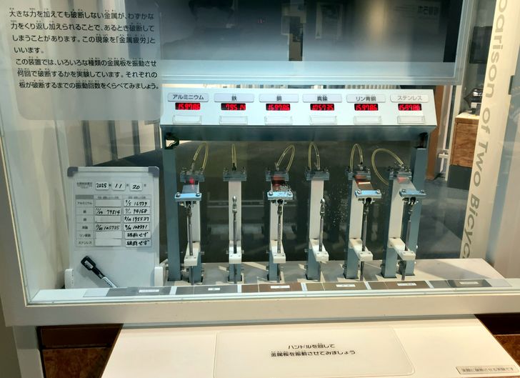 理工館5階の「物質・エネルギーのせかい」のフロアに「金属疲労」の展示がありますが、金属の切れる回数表示に工夫がありました。