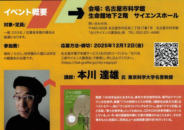 古川為三郎サイエンス講演会「ゾウの時間・ネズミの時間・私たちの時間」の開催場所は、名古屋市科学館・生命館地下2階のサイエンスホールです。参加費は無料ですが「科学館の観覧料」は必要です。応募方法は「名古屋市電子申請サービス」から、締切は2025年12月12日(金)までです。定員は200名で、応募者多数の場合は抽選になります。