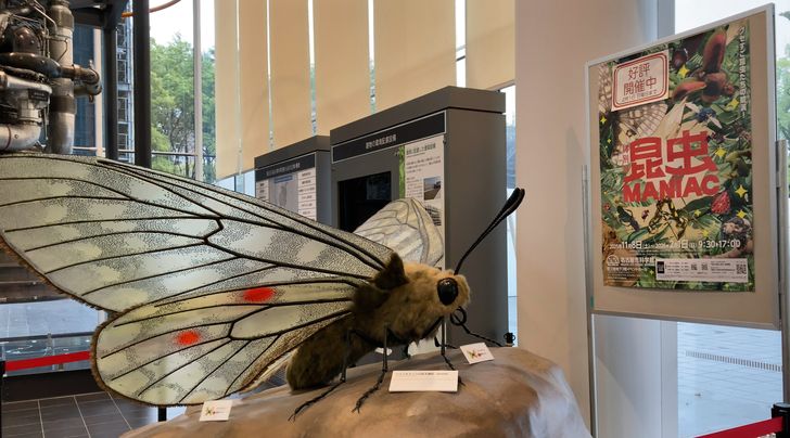 特別展「昆虫・MANIAC」の開催に合わせて、理工館6階の「話題の科学」は「写真で見る秋冬の昆虫」の紹介、エントランスホールには「ウスバキチョウの拡大模型(約60倍)」が展示されています。