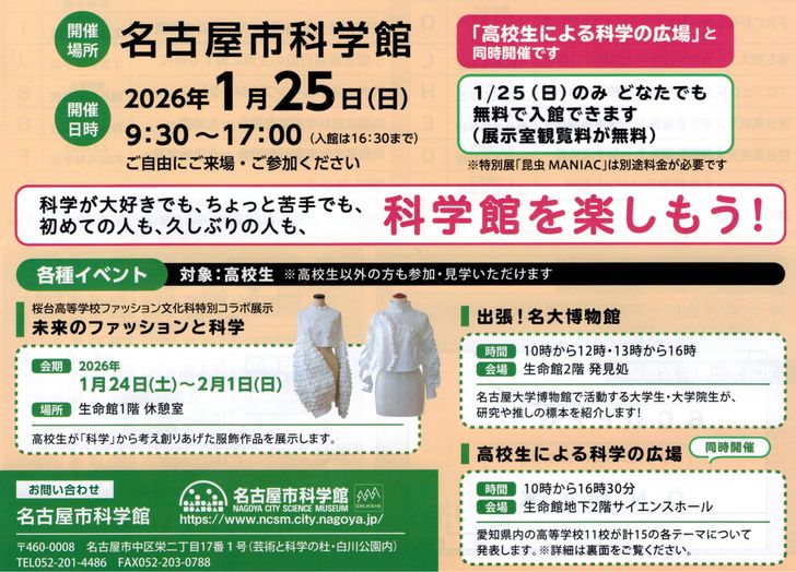 名古屋市科学館で毎年開催されている「高校生のための科学の日」が2026年1月25日(日)に開催されます。この日は例年、高校生は無料入館できましたが、今回はどなたでも展示室観覧料が無料(特別展「昆虫・MANIAC」は別途料金が必要)となるようですので、是非来館してください。