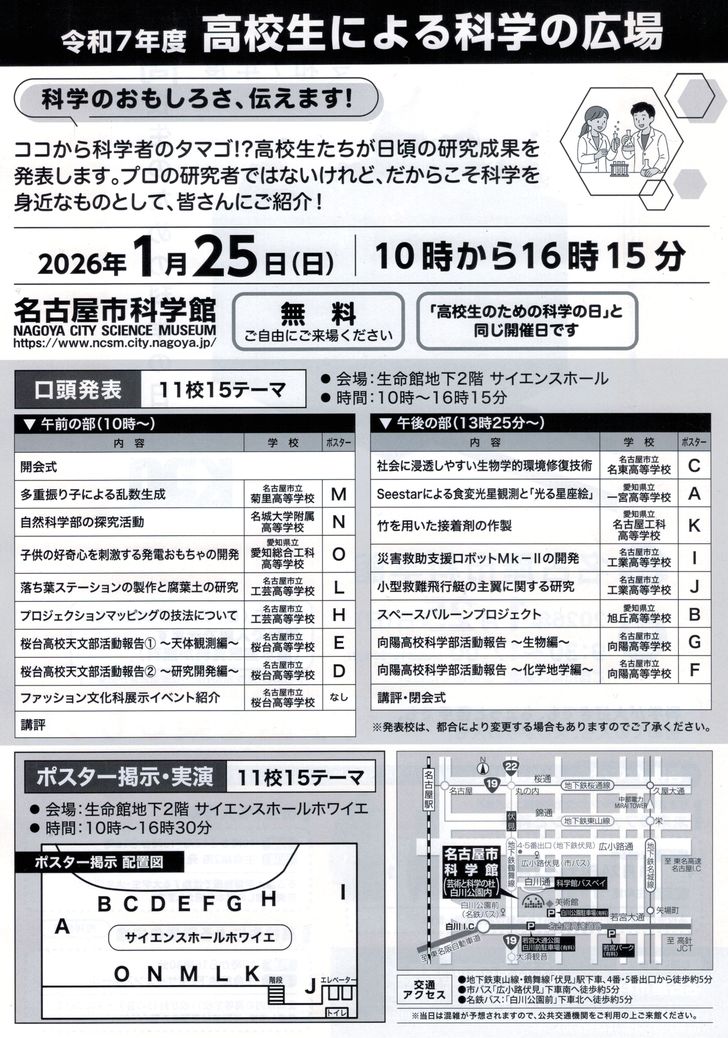 同日に、生命館地下2階のサイエンスホールで「令和7年度・高校生による科学のひろば」開催されています。高校生たちが日頃の研究成果を発表します。プロの研究者ではないけれど、だからこそ科学を身近なものとして紹介していますので、こちらも是非ご覧ください。