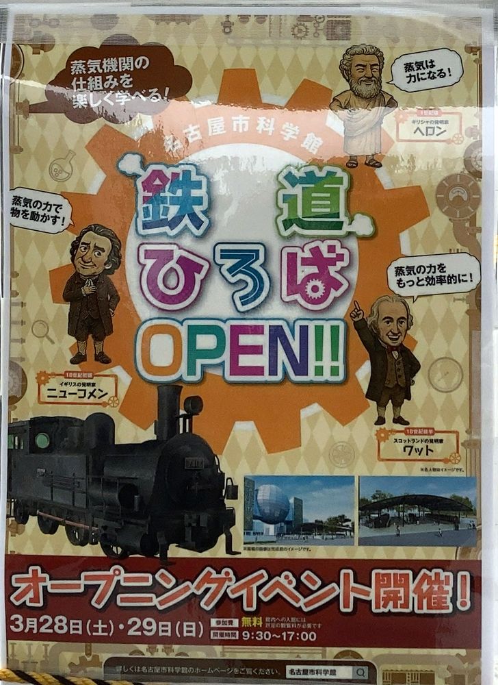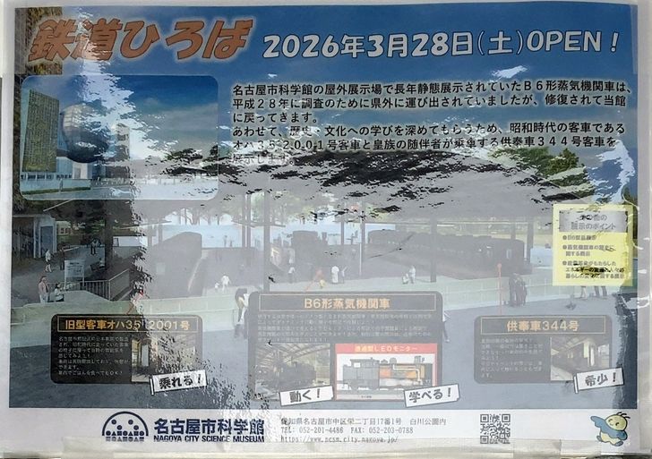 長らく修理に出ていたB6蒸気機関車が動態展示として戻り、JR東日本から譲渡を受けた旧型客車と供奉車が展示されるなど、屋外展示物が充実されるようです。詳しくは、名古屋市科学館の公式ホームページをご覧ください。